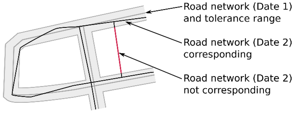 Figure 11 shows an example of the comparison of two road network datasets of different years. In the upper left subfigure, the more recent network has been evaluated against the buffered previous data resulting in the detection of new streets. The upper right subfigure shows the opposite procedure of checking the older network against the buffered more recent data, which enables one to detect features that haven been removed.