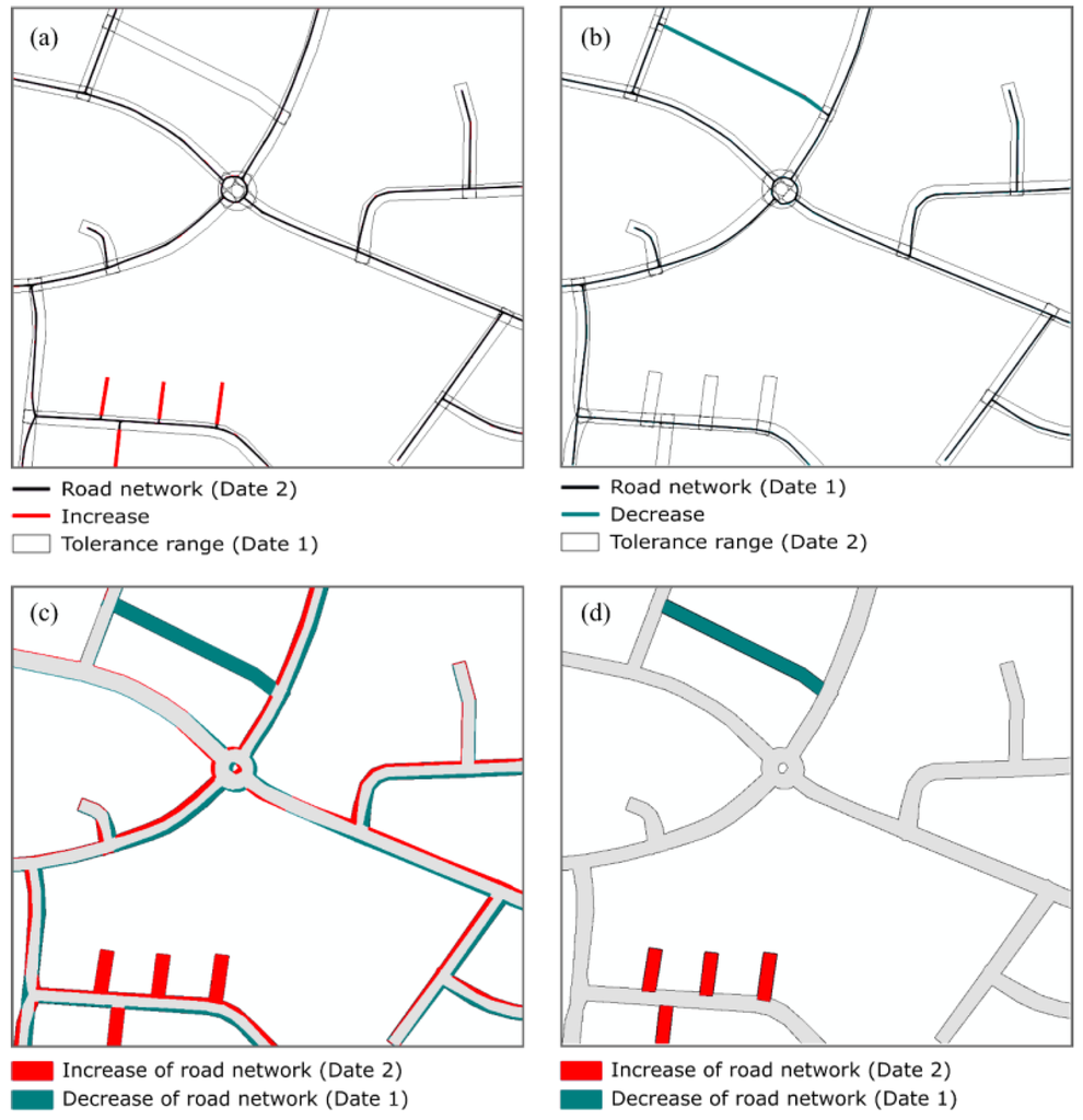 Implementation of tolerance filters regarding line shifting for multi-temporal road network features: (a) increase of road network with a tolerance range of 5 m; (b) decrease of road network with a tolerance range of 5 m; (c) intersection result of uncorrected road network change detection; (d) result of the change detection for the road network with tolerance filters regarding line shifting.