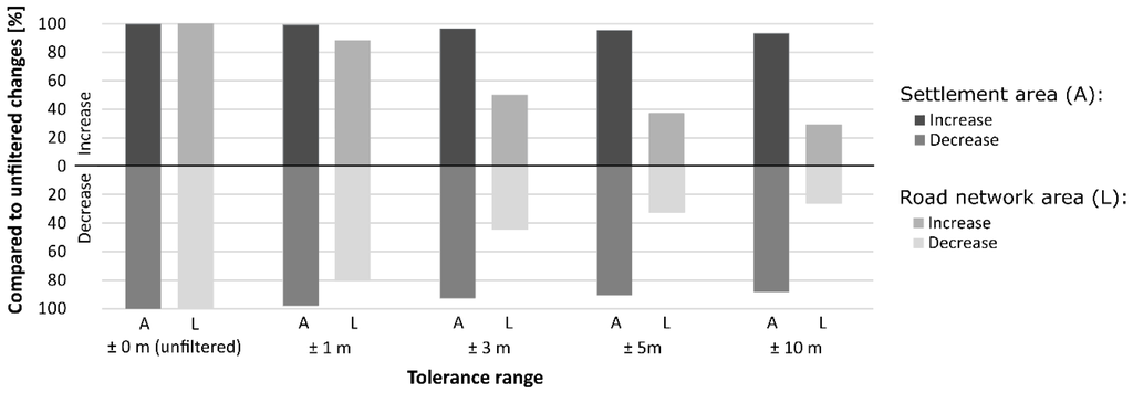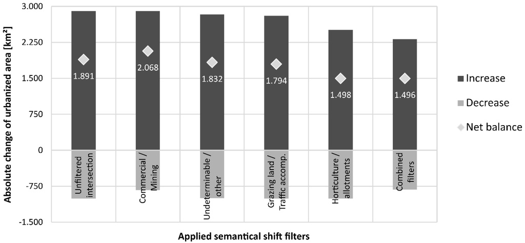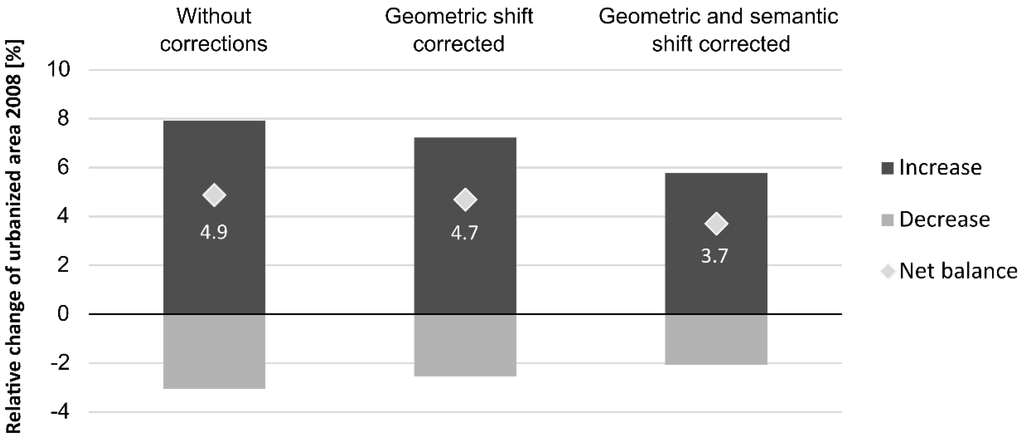 Figure 14 shows the effect of the filtering on the detected land transformations between urbanized areas and open space. The left bar indicates the results of the uncorrected intersection, which sums up to a net increase of urbanized areas of 4.9% from 2008–2013. The correction for geometrical shifts has a minor effect of reducing the net balance to 4.7%, whereas the additional correction for semantic shifts (adjusting for known effects of the ATKIS model migration) brings the value down to 3.7%