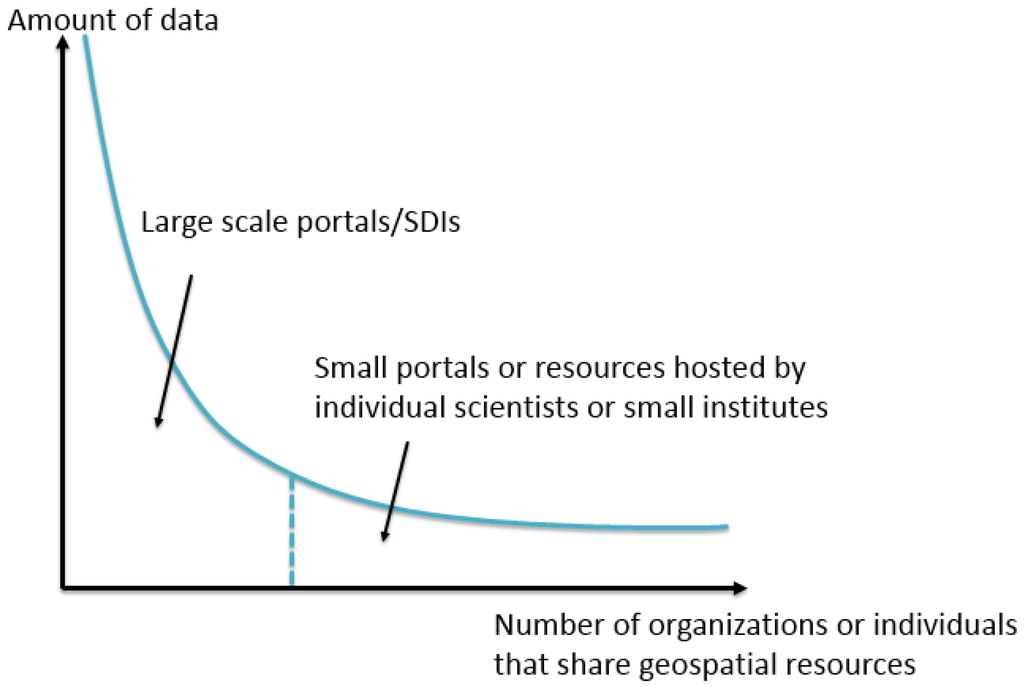 Furthermore, resources outside geospatial data portals/SDIs are important as well. Based on [12], the GeoWeb resources can be modeled as a long tail (Figure 1). While most geospatial data portals and SDIs are managed by a small number of government or research institutes, these portals and SDIs provide a substantial amount of geospatial data. These data are called as the “head” in the long tail and usually accessible to users. On the other hand, there are small data portals and GeoWeb resources hosted by a large number of individual scientists or small institutes, which comprise the “tail”. According to the long tail theory [13], the amount of data in the tail equals to the amount in the head. However, the resources in the tail are not indexed by the data portals or SDIs in the head, and usually are undiscoverable to most users. Besides, one of the important features of GIS (Geographic Information System) is overlaying interdisciplinary layers and discovering the relations between them. Especially for data scientists, they may not always know where to find the geospatial data they need [14]. In this case, it is important to have a repository to organize various types of geospatial data. Therefore, in order to provide users a complete index of GeoWeb and a one-stop entry to find every GeoWeb resource, we need a solution that can automatically discover every geospatial resource shared online.