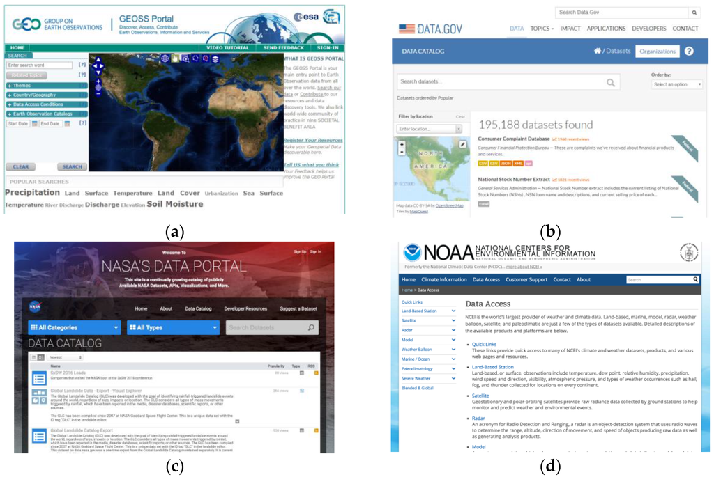 Examples of data portals/SDIs: (a) Global Earth Observation System of Systems (GEOSS); (b) Data.gov; (c) National Aeronautics and Space Administration (NASA)’s data portal; and (d) National Climatic Data Center.