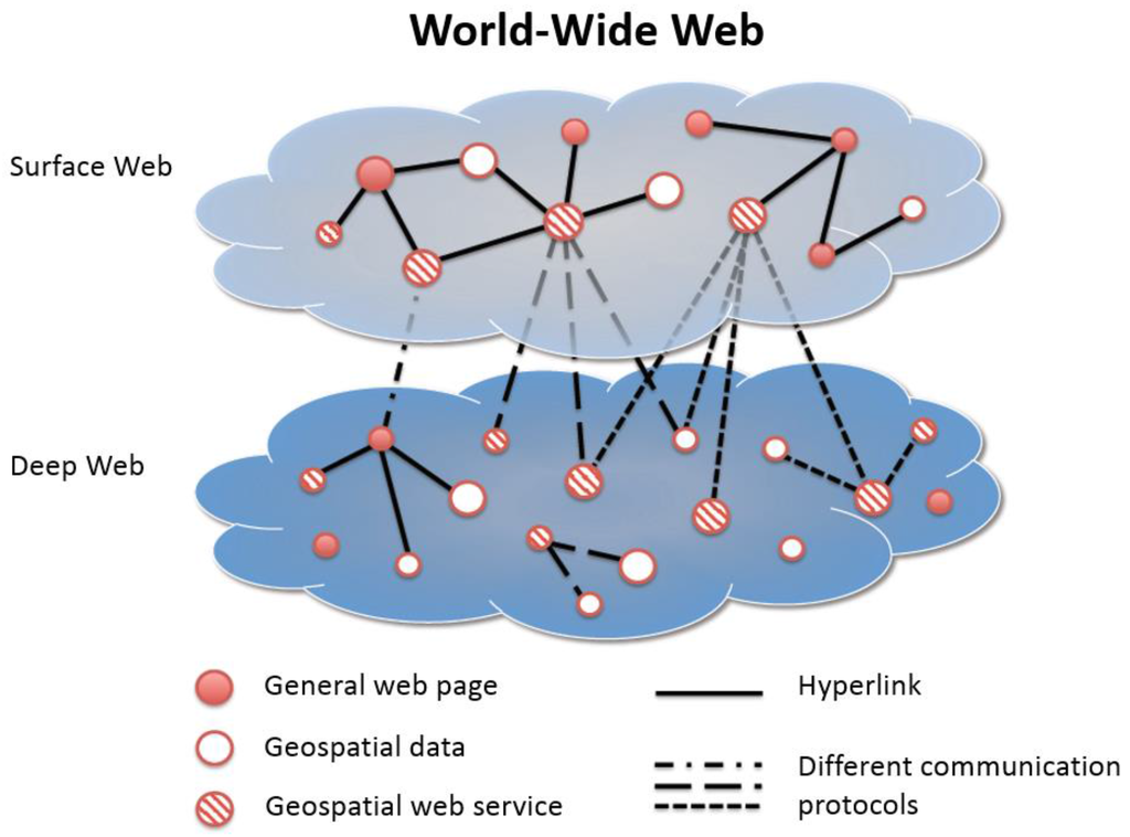 To have a more clear definition of our search targets, we classify the WWW into four parts: (1) geospatial web service on the Surface Web; (2) geospatial data on the Surface Web; (3) geospatial web service on the Deep Web; and (4) geospatial data on the Deep Web. The concept is shown in Figure 3. Li [21] defines the “Surface Web” and the “Deep Web” on the WWW. The Surface Web means the Web that users can access through hyperlinks and is visible to general web crawlers. However, some resources are hidden on the WWW, whose addresses cannot be accessed through the Surface Web via hyperlinks. These resources are called in the Deep Web, such as datasets in web services or data portals/SDIs. In order to find resources in the Deep Web, we need to traverse through the services on the Surface Web by following their specific communication protocols.