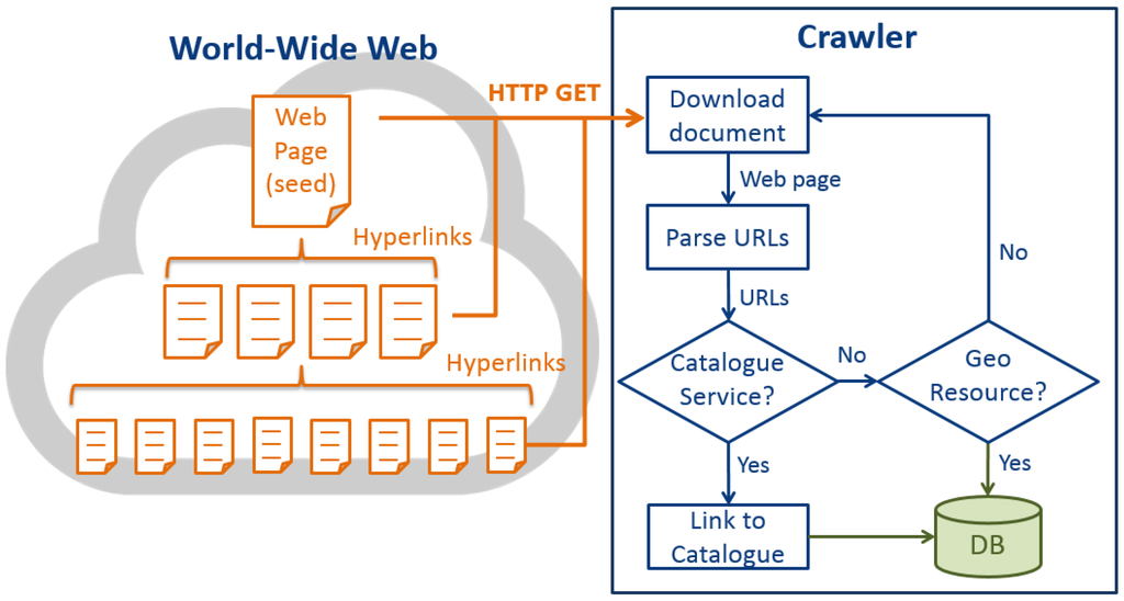 In general, these problems of existing GeoWeb resource discovery approaches make geospatial data discovery inefficient and limit the growth of the GeoWeb. To address this issue, this study learns from the WWW resource discovery solutions as WWW also has wildly-distributed resources. To be specific, we aim at building a GeoWeb search engine to provide users a one-stop service to discover geospatial data while avoiding the requirement of asking data providers to register resources. However, to achieve this GeoWeb search engine vision, one of the first steps is to collect a complete index of GeoWeb. As general web search engines apply web crawlers to collect indexes of web pages, a GeoWeb search engine also requires a GeoWeb resource crawler. Hence, we review the existing GeoWeb resource crawler solutions in the next sub-section.