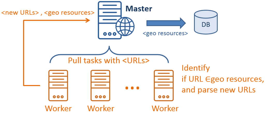 In general, we design the GeoWeb Crawler with the MapReduce concept. As shown in Figure 5, one machine is assigned as the master and connects to a number of worker machines. Each worker sends a request to the master to retrieve candidate URLs as tasks. Workers then identify if those URLs belong to geospatial resources with the rules presented in Section 4.3. If a URL is not a geospatial resource, the worker will retrieve and parse the HTML file for new URLs. Identified geospatial resources and new URLs are then returned to the master. The master will store geospatial resources to a database and assign new tasks (i.e., URLs) to workers. As the crawling processes are independent, each worker can perform in parallel. With the designed processing workflow, the GeoWeb Crawler can be scaled horizontally to enhance the performance.