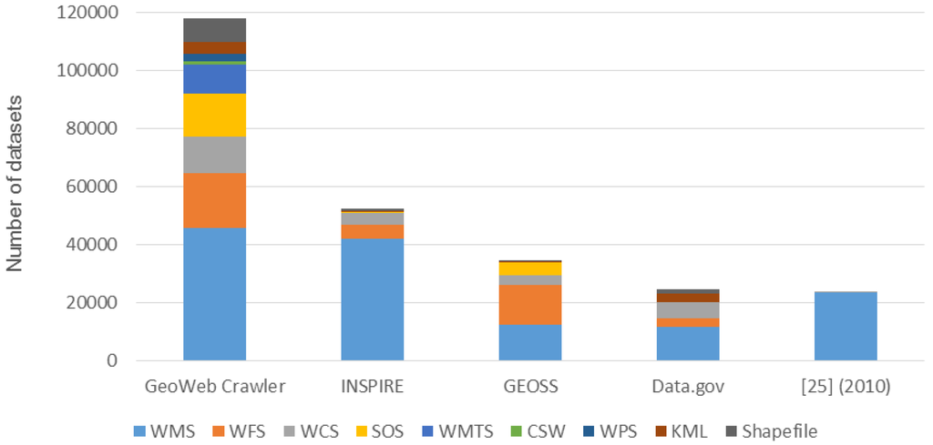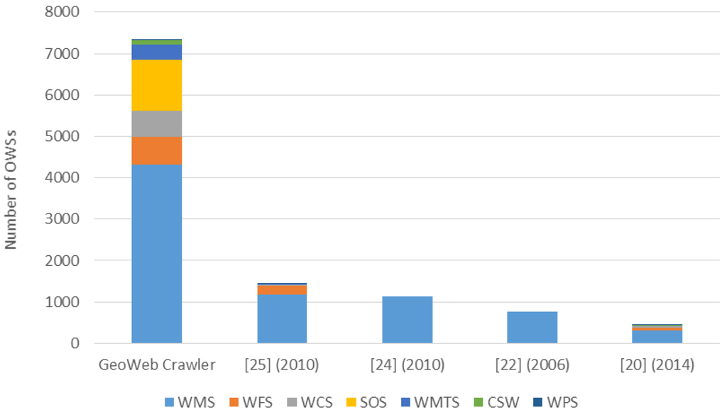 In addition, there are existing approaches crawling OWS, such as PolarHub [21] in 2014, Sample et al. [23] in 2006, Li and Yang [25] in 2010, and Lopez-Pellicer et al. [26] in 2010. In Figure 9, we compare the numbers of OWS between these works and the GeoWeb Crawler. We can see that the GeoWeb Crawler can collect more types of OWS resources than other work did. With the large-scale crawling framework, GeoWeb Crawler can discover significantly more OWSs than other approaches. Overall, the GeoWeb Crawler collects 3.8 to 47.5 times more resources (including the satellite images) than any existing geospatial resource discovery solution.