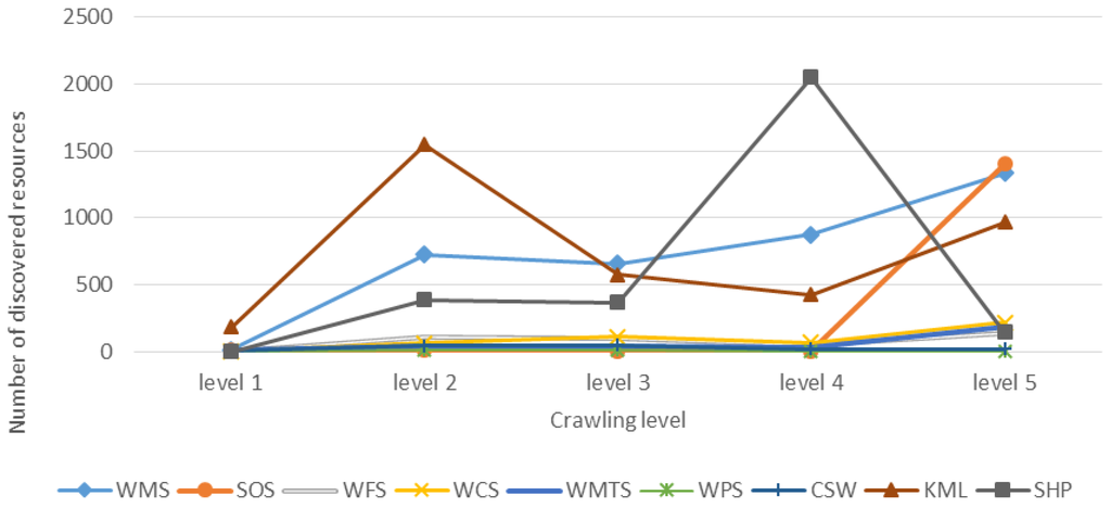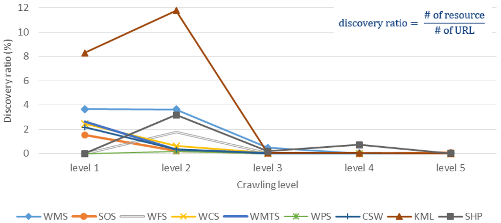To understand the distribution of geospatial resources, we display the numbers of discovered resources (services and files) in each crawling level in Figure 10. The figure indicates that more resources can be found with larger crawling level for most of the resources. However, in Figure 11, we show the discovery ratio of each resource in each crawling level, which is the number of discovered resources divided by the total number of URLs in each crawling level. While the discovery ratio represents the necessary effort of crawling, we can see that the trends of discovery ratio are decreasing along the crawling levels because of the rapid growth of URL numbers.