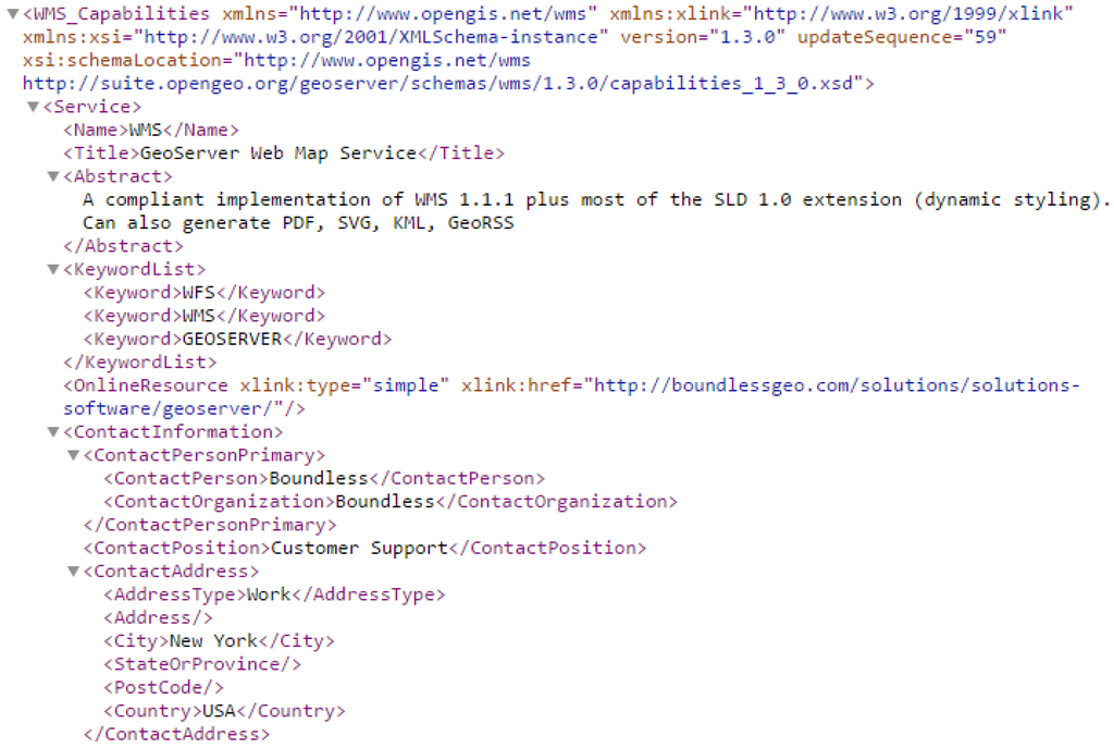 - OGC WMS: According to the WMS specification [32,33], the Capabilities document shall contain a root element named “WMT_MS_Capabilities” or “WMS_Capabilities” for the version 1.0.0 and 1.3.0 of WMS, respectively.
