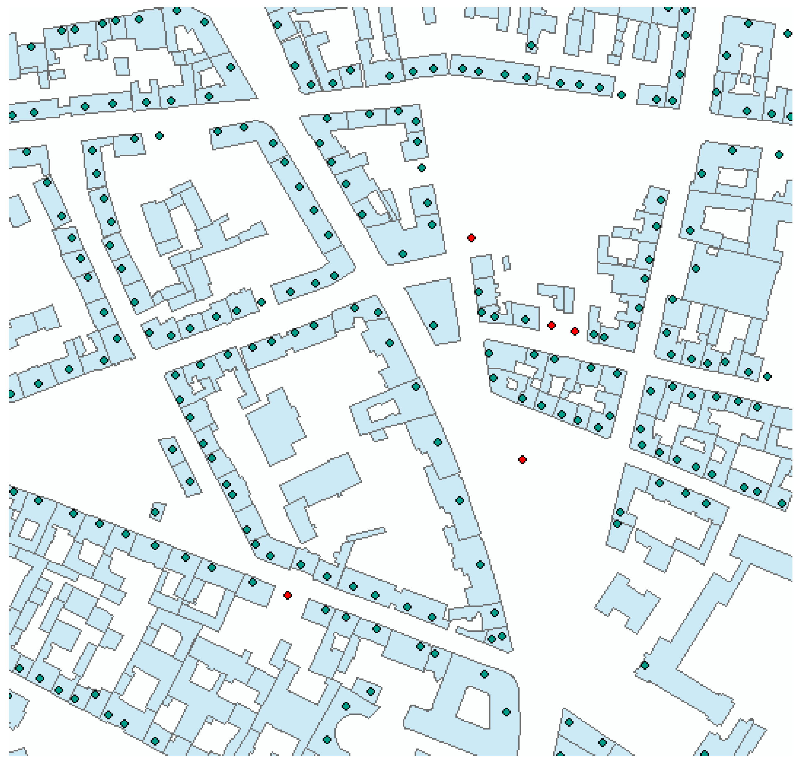 In the next step, the number of address points per building polygon is calculated. A tolerance is introduced in order to match the building polygon data with the address point data. Specifically, a buffer distance is set to 2 m using the SpatialJoin_analysis tool from ArcGIS with the “CONTAIN” and “WITHIN_A_DISTANCE” option. In order to reduce ambiguities, the buffer distance is set to a lower value than the distance space between building and parcel border as stipulated in the German Model Building Code [61]. The buffer is only applied to the coordinates outside a building polygon, so in the process these outside coordinates are selected and matched in advance. Each of these join operations calculates a “Join_Count” attribute so that the sum of these counts is the number of addresses per building. The value is stored in the attribute ADDNUMB, which is useful for separating main buildings from outbuildings.