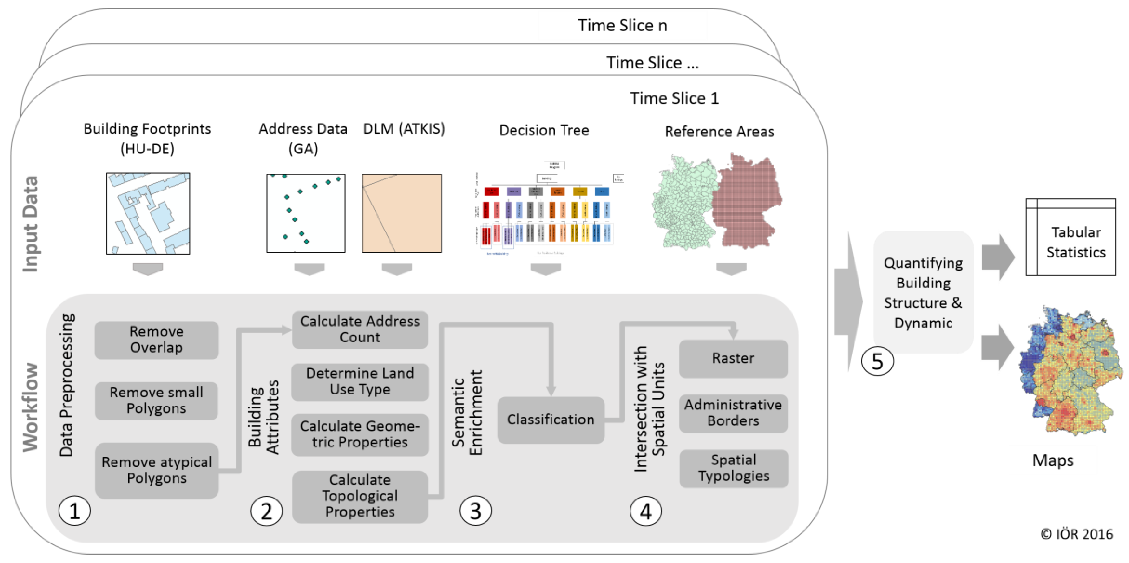 The workflow for an automatic quantification of structure and dynamic is depicted in Figure 3. This encompasses several steps: (1) data pre-processing; (2) calculation of building attributes; (3) semantic enrichment; (4) intersection with spatial units; and finally (5) quantification of the building structure and dynamics based on the defined spatial units. The processing Steps (1) to (4) are performed for each time point whereas (5) uses the results for each processing point. As mentioned in Section 4, no semantic information on building type (i.e., detached, semi-detached or row) is available for the building footprints. Using auxiliary data such as address data and the digital landscape model from ATKIS, a set of building attributes describing the characteristics of buildings is derived for a rule-based classification. All processing steps are implemented within a Toolbox in ArcGIS 10.3 (Advanced License) using Python (www.python.org) scripts. This is explained in greater detail below.