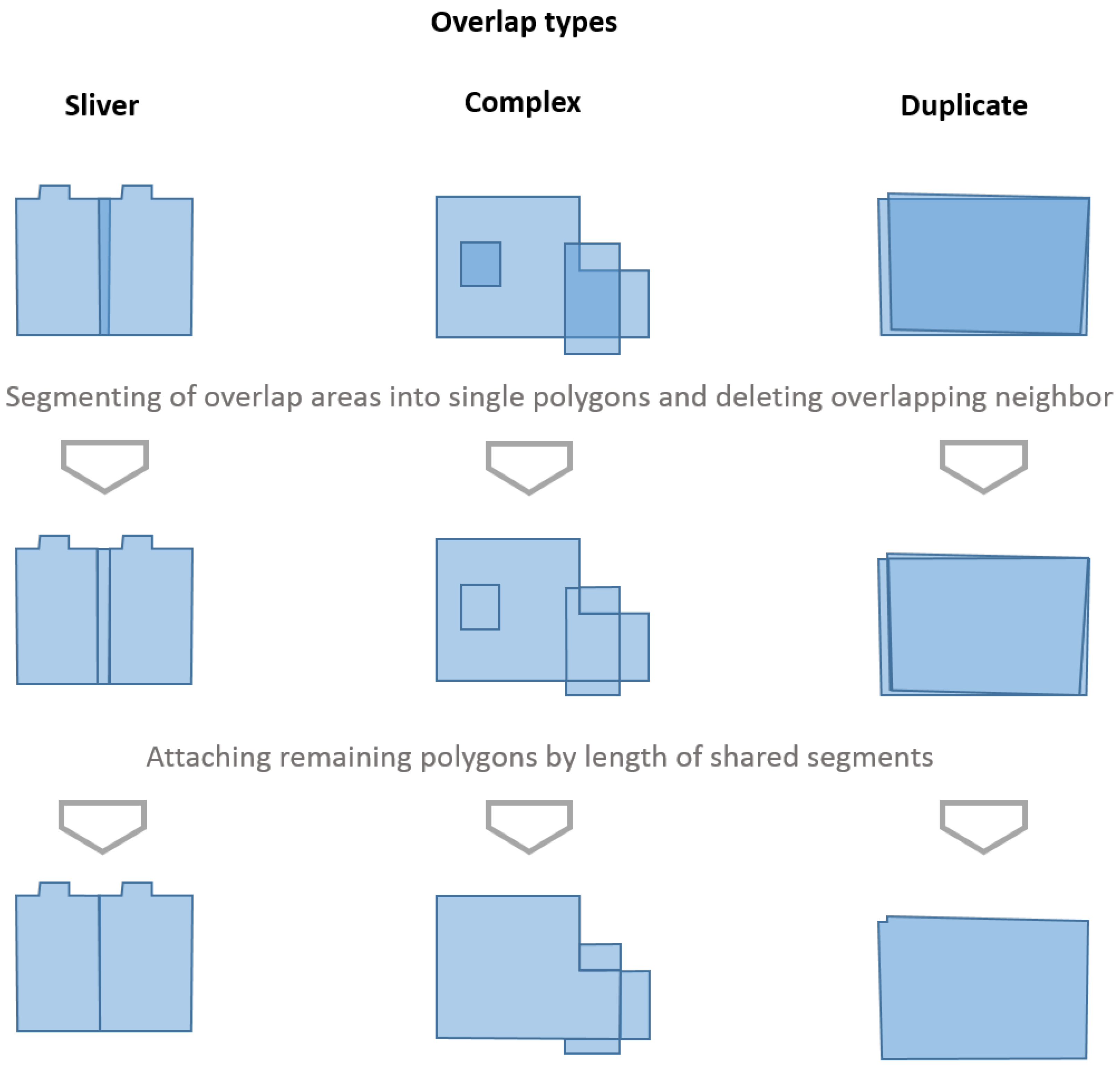 The identified topological inconsistencies are removed automatically in a two-step approach (see Figure 4). Firstly, a union of all polygons is calculated, by which all intersection points between overlaying polygons are created as new nodes of the overlapping areas. In the resulting dataset, the overlapping areas are segmented into single polygons and overlay each other as duplicates. The IDs of these polygons are identified by a polygon neighbor analysis and half of these is selected for deletion. In the second step, the other half is selected and aggregated to the adjacent polygon with the longest shared border. Geometries are changed during overlap removal and it is possible that new polygons are created. Mostly this occurs when complex overlaps are removed. The following steps help to minimize any negative effects of these geometric changes.