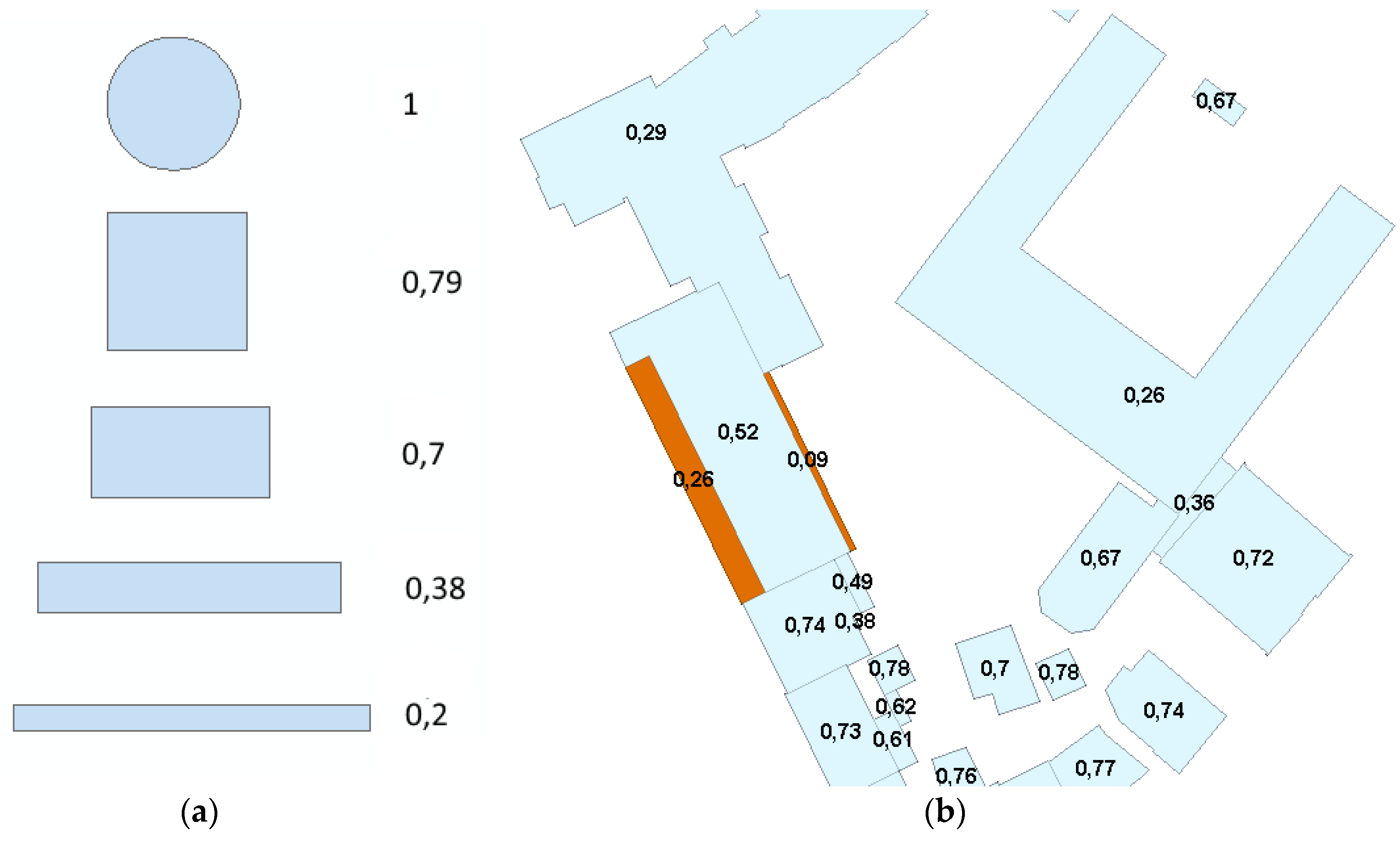 Exemplary shapes (a) and real data building polygons (b) with respective shape indices. The highlighted polygons in the real data have an area of less than 190 m2 (Geodata: HU-DE © GeoBasis-DE/2015).