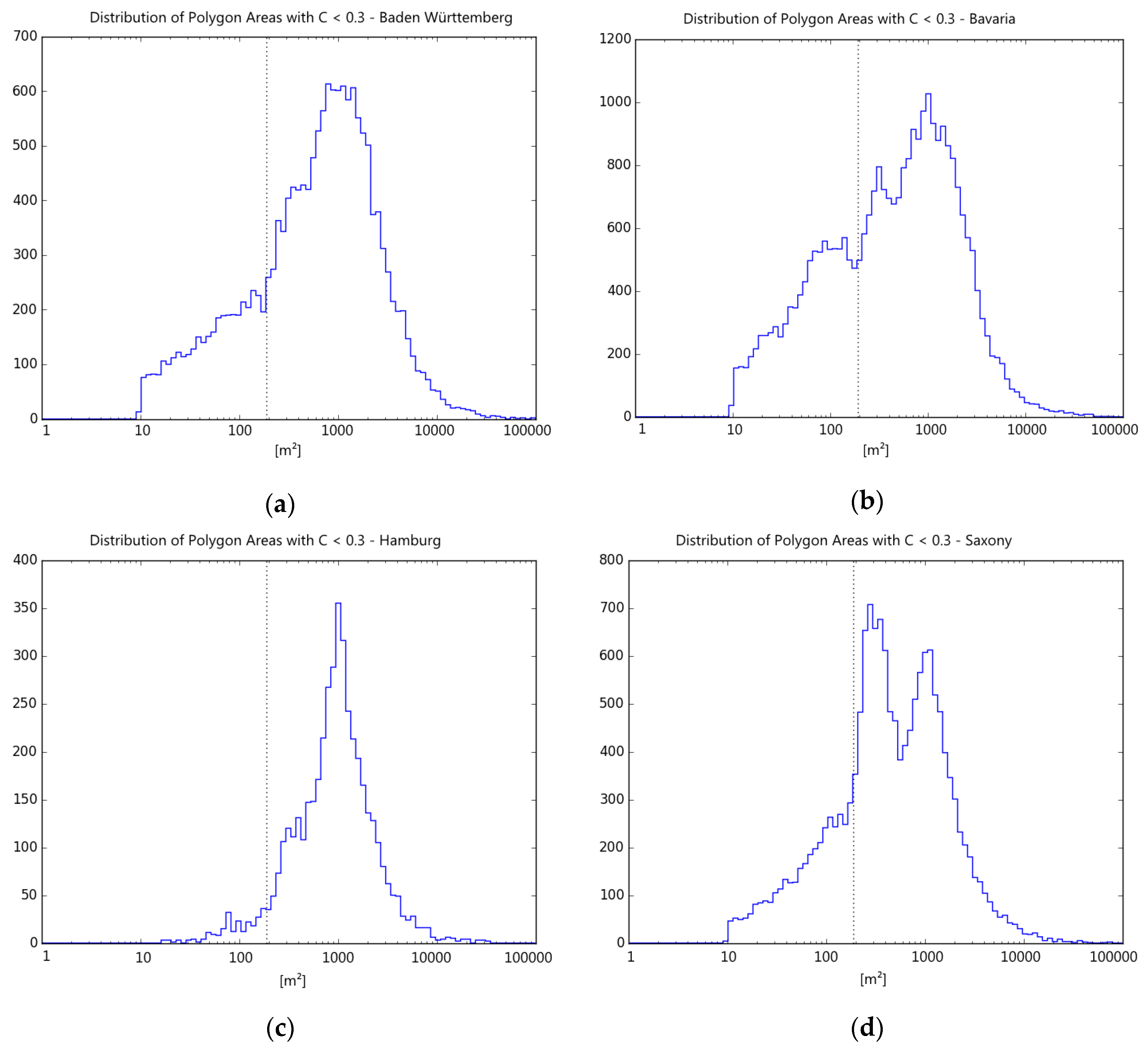 Exemplary histogram plots for shape area (log. x-axis) of polygons selected by shape index less than 0.3: (a) Baden-Württemberg; (b) Bavaria; (c) Hamburg and (d) Saxony. There is a visible multimodality, the minimum at area of 190 m2 was chosen for size threshold (marked by the vertical line).