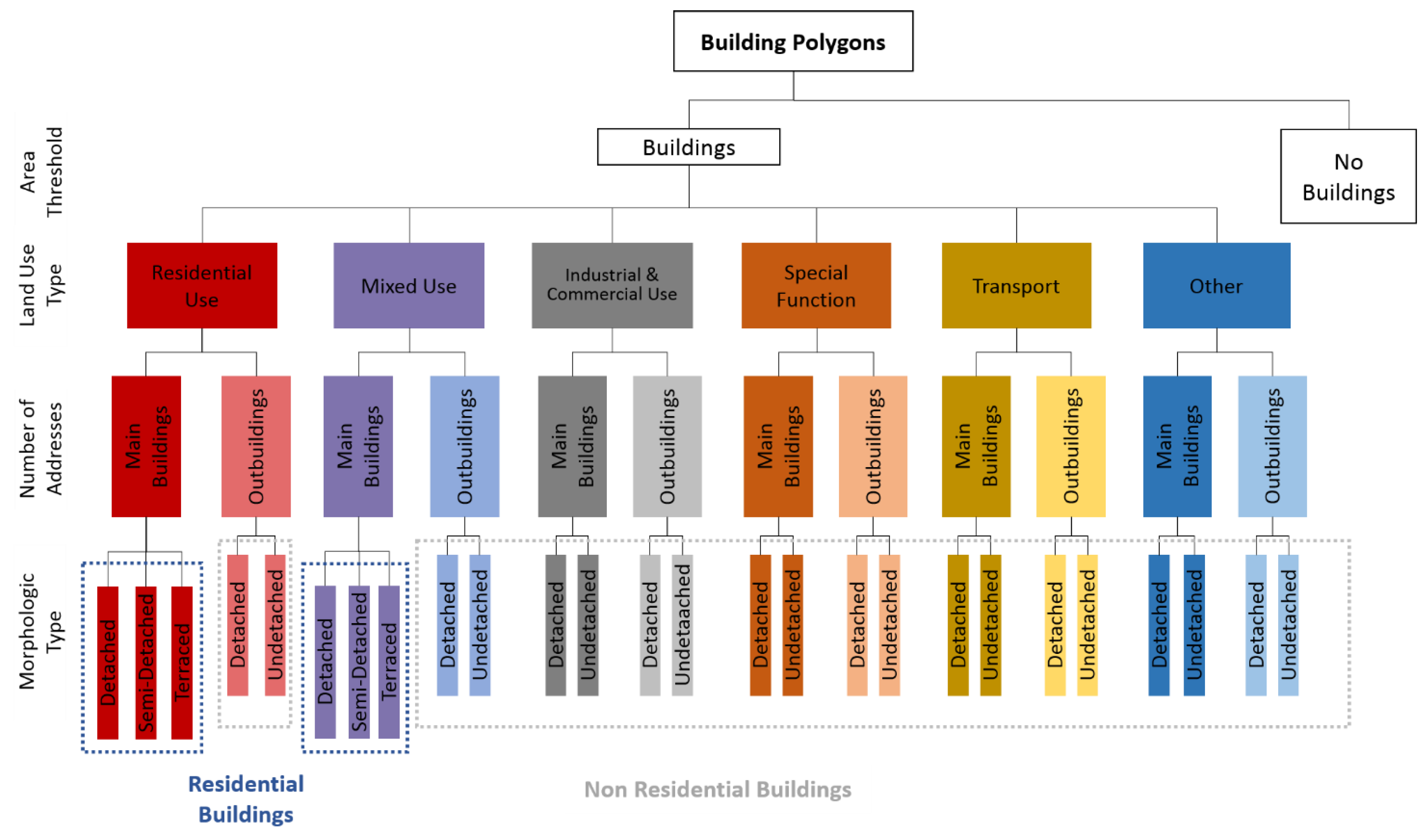 After calculating attributes, the building footprint data is semantically enriched with building type information. In order to assign a class code to each polygon a pre-defined hierarchical rule set is applied, Figure 7 shows the used building typology. Initially, all non-buildings are discarded before the buildings are further classified according to the underlying land use type (LUT). The information of the number of address points helps to distinguish the main building and the outbuilding on the next level. Finally, for residential and mixed used buildings, the morphologic type (detached, semi-detached and terraced) is distinguished by using the sum of ADDNUMB (number of matched addresses) and number of addressed neighbor polygons (N_NBR_ADD). In the classification process the attribute field CLASS is added to the building polygons and an alphanumeric string value (class code) is built. The format of the class code is “A0000”, where the leading character denotes the usage type of the class and the following positions provide information about building rank and morphologic type (the second and last position). Within an update cursor iteration on the features, the previously calculated fields are evaluated and CLASS values are determined. The construction of a class string is presented in this pseudocode: