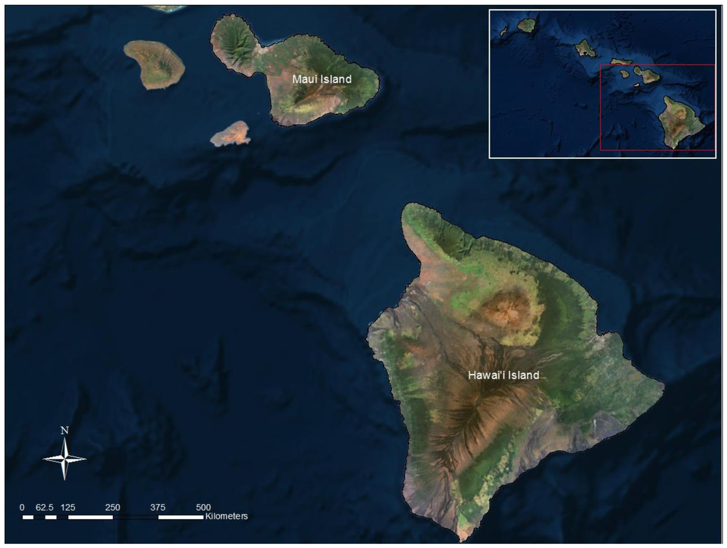 The administrative boundary for Hawaii and Maui Islands in the state of Hawaii is shown in Figure 1. Hawaii and Maui are the two largest islands in the state with total land areas of 10,458.85 km2 (2,584,440 acres) and 1888.63 km2 (466,690 acres), respectively. Land for agriculture and conservation uses constitute large portions of land use for these islands. Agriculture and conservation account for 45.8% and 52.0% of the total land area on Hawaii Island and 50.4% and 43.7% on Maui Island, respectively [].