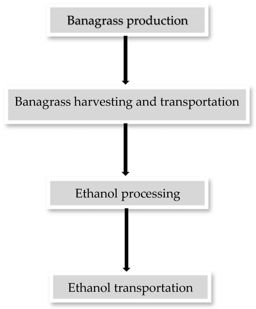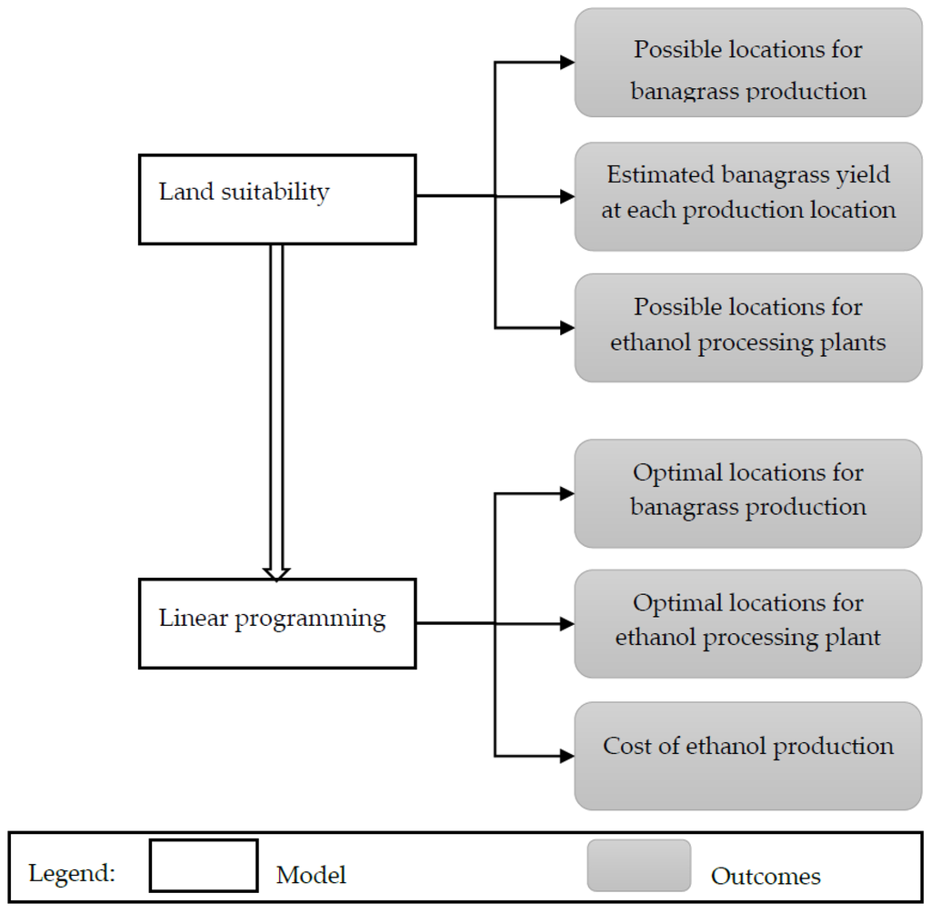 The Methodological Flowchart used for this study is illustrated in Figure 2. The land suitability model uses Analytic Hierarchy Process (AHP) combined with Geographic Information System (GIS) to determine suitable banagrass production areas and ethanol processing sites. A linear programming (LP) model minimizes ethanol production costs by optimally selecting land locations for banagrass production and ethanol processing. The GIS-based approach using ArcGIS version 10.1 (ESRI, Redlands, CA, USA) and mathematical methods using MATLAB R2013a (MathWorks, Natick, Massachusetts, USA) are applied in this study.