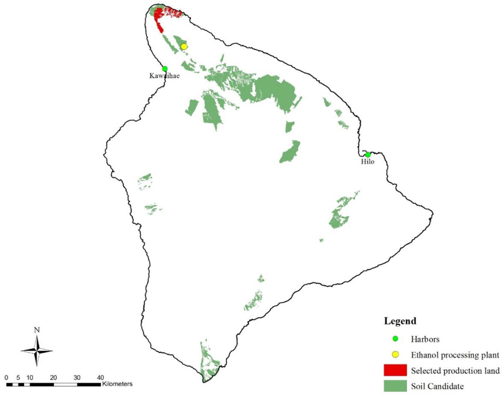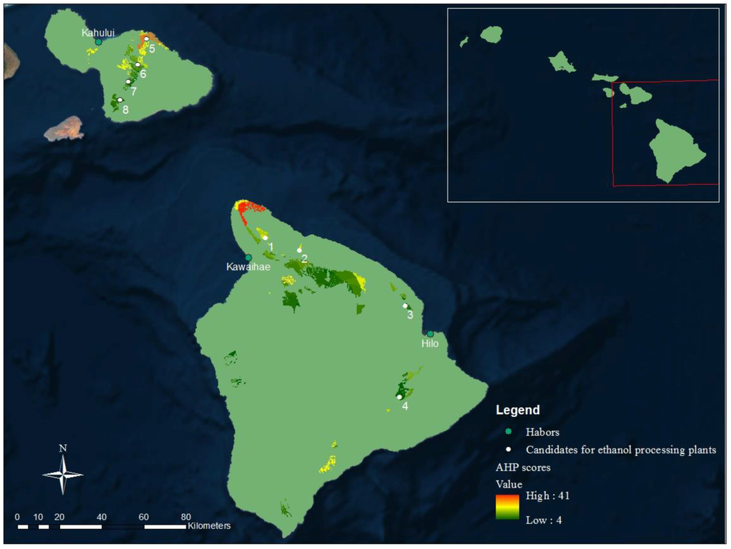 The land suitability model identifies the possible land locations for banagrass production and location candidates for an ethanol processing plant on Hawaii and Maui Islands. The data preparation process examines the land areas that meet all the requirements for banagrass production. A total of 70,373 ha of land located on both islands—59,500 ha on Hawaii Island and 10,873 ha on Maui Island—is determined as potential area for production. The analytical hierarchy process (AHP) and geographic information system (GIS) methods were used to evaluate land suitability and corresponding banagrass yields for the selected areas.