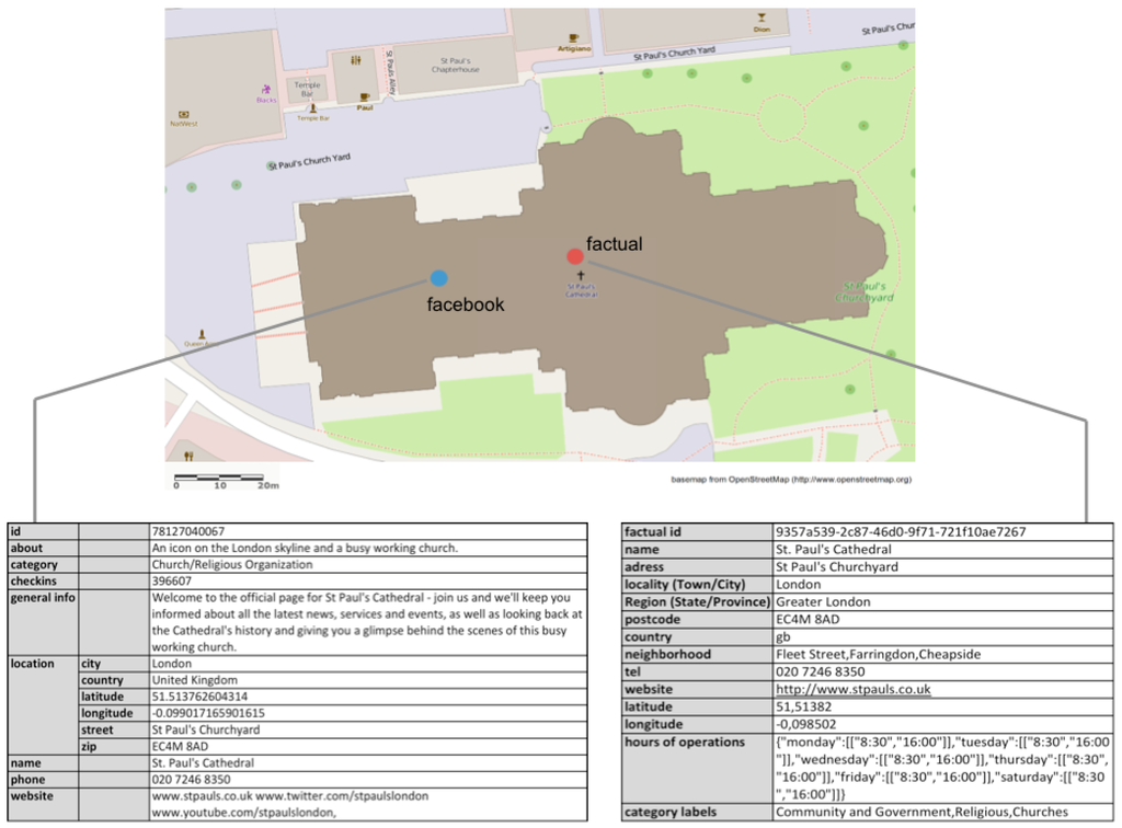 For illustrative purposes, the developed concept is applied to the hypothetical example of a researcher who aims to use a crowdsourced POI dataset for two different purposes, and is now facing the challenge of assessing its fitness-for-use. In our simple example, the POI dataset consists only of one point feature, namely Facebook’s POI representation of St. Paul’s Cathedral in London, which was obtained via Facebook’s Graph API. Since a reference dataset is always required for an extrinsic quality assessment, the co-referent POI is taken from Factual, a commercial vendor of quality-ensured POI datasets. In general, however, when choosing appropriate ground truth data sources, one should acknowledge the fact that nowadays, the traditional assumption of authoritative or commercial datasets being of a higher quality compared to VGI is no longer fully reliable. Thus, reference datasets must be chosen with care and in the specific context of the particular case study, a challenge which, however, is inherent to extrinsic quality assessment methods in general and, therefore, exceeds the scope of this work.