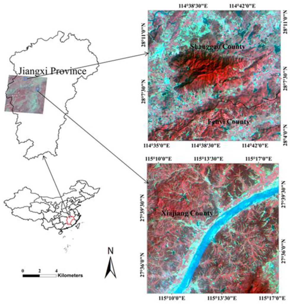 The study area was located in the Midwest of Jiangxi Province, China, covering the range from 26°29’18’’N to 28°21’42’’N latitude and 113°26’13’’E to 115°45’50’’E longitude. The geolocation of the study area is shown in Figure 1. This area has a typical eastern subtropical monsoon climate, i.e., warm and humid, abundant sunshine and rainfall, and four distinct seasons. The predominant geomorphologic types are mountains, hills, and plains. In addition, the land surface type is mainly characterized by forest, cropland and water.