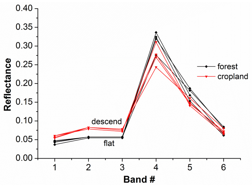 Because of the natural complexity and the fact that the same object has different spectra, more than one identification templates were designed for one kind of object. Meanwhile, one may note that identification templates in Table 3, Table 5 and Table 8 for cropland, forest and water classes, respectively, are similar. The same phenomenon occurs in Table 4, Table 6 and Table 9. This also indicates that different objects have the same spectrum. However, the differences between them lie in the different threshold ranges in the last column in a certain row. Specifically, Table 3 holds the lowest threshold of 0.0718 in the fifth row vs. Table 5 with highest value of 0.0717, and Table 3 holds the lowest threshold of 0.1553 in the seventh row vs. Table 8 with highest value of 0.1408. The different thresholds in similar identification templates, which made the different objects to be separable, were in bold. Table 7 and Table 10, which indicate the unique spectral curve shapes for forest and water classes, respectively, are different from others.