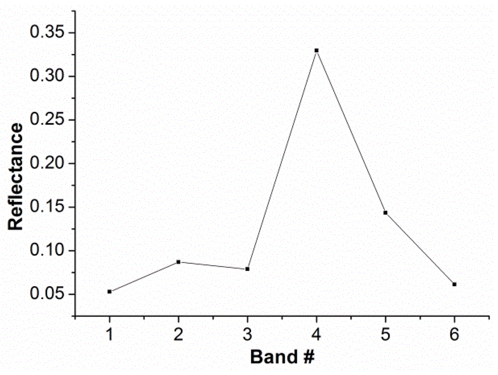 Specific to the remotely sensed data, such as the TM data, the spectral curve shown in Figure 4 is composed of two ascending segments (from bands 1 to 2 and bands 3 to 4, respectively), two descending segments (from bands 2 to 3 and bands 4 to 6, respectively), two peaks (located at bands 2 and 4, respectively) and one valley (located at band 3). Whether bands j to k is the ascending, descending or flat segments is determined by the following criteria outlined in Table 1. Specifically, the ascending, descending or flat segment is between two inflection points, at which the curve changes from decreasing trend to increasing trend, or to flat, and vice versa. Through use of the symbolization method and the attribute composition of each morpheme vector as defined above, the values in Table 2, which show the numerical description of the reflectance spectrum shown in Figure 4, can be obtained.