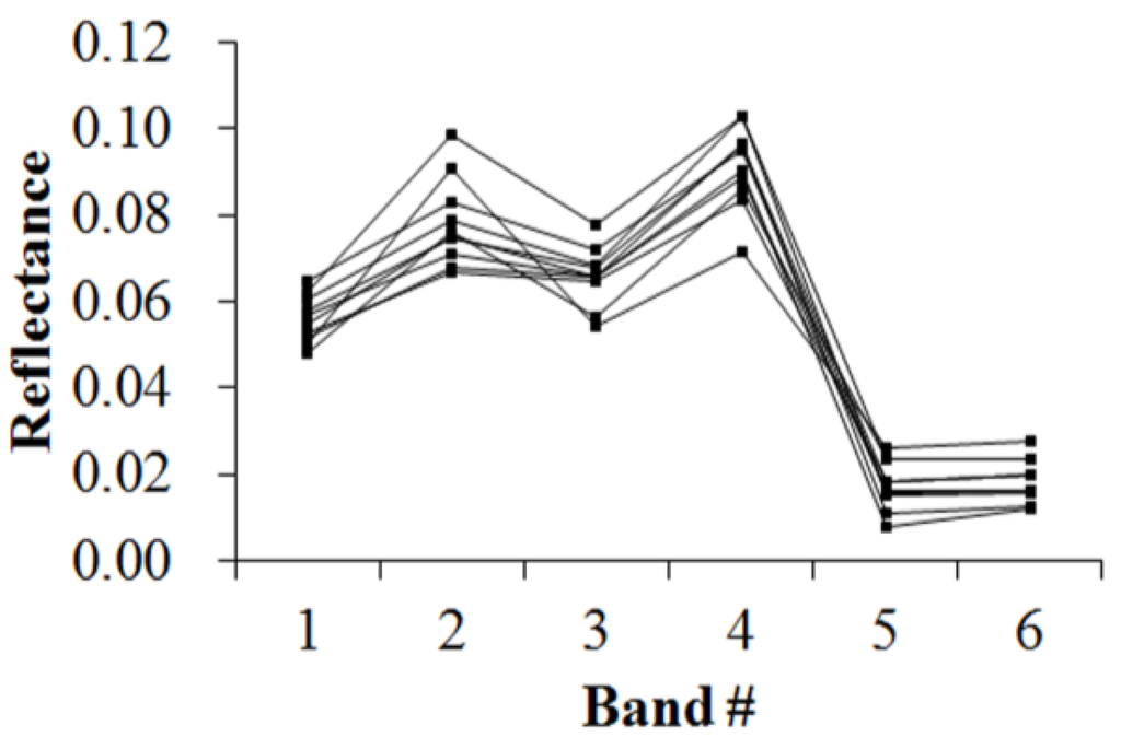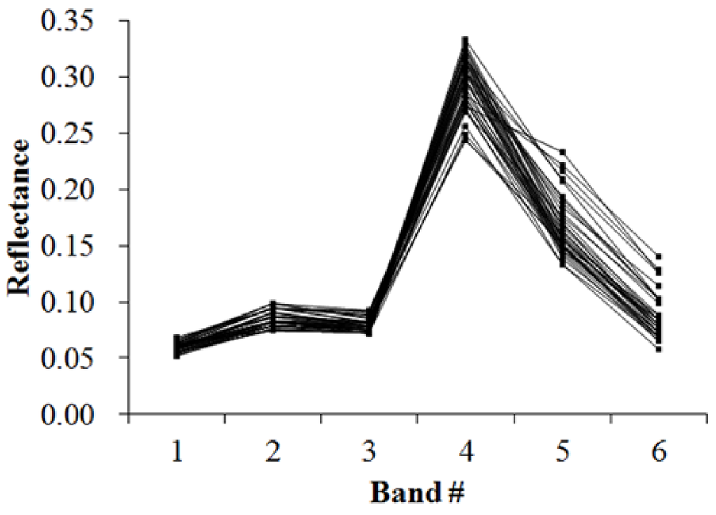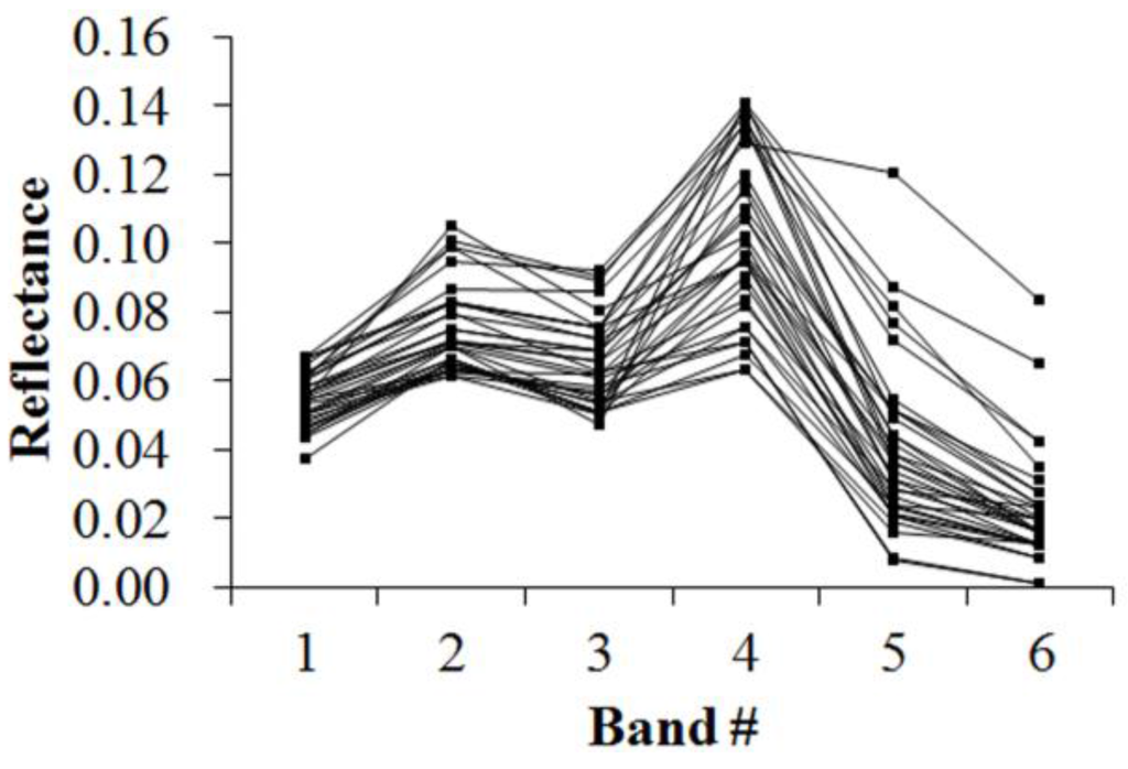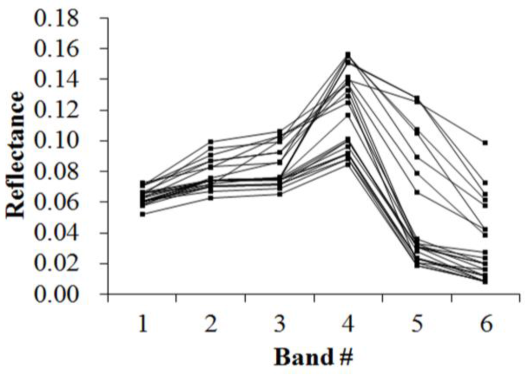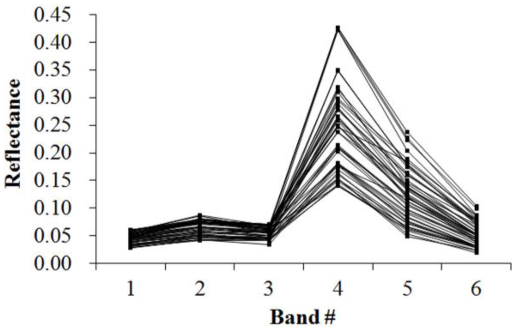 Spectral signatures, which are simply plots of the spectral reflectance of an object as a function of wavelength [15], provide important qualitative and quantitative information for image classification. Therefore, spectral signatures are the basis for classifying remotely sensed data. It is worth noting that spectral signatures include not only the spectral values but also the spectral curve shape. However, for most classification approaches using spectral signatures, spectral values received considerable attention while focus on spectral curve shape was lost. This was mainly reflected in the following aspects: (1) some descriptive statistics (e.g., average, maximum, and minimum) [10,15,16] were generated from the training samples on the basis of a normal distribution assumption; (2) some spectral indices such as NDVI (Normalized Difference Vegetation Index) and NDWI (Normalized Difference Water Index) [17,18,19,20] were constructed as covariates; and (3) for hyperspectral images, a spectral angle mapper (SAM), which determines similarity between the reference and target spectra, was often calculated [21,22]. Based on the process above, further image classification was performed by taking some classification metrics into consideration, such as the Jeffries–Matusita distance, average divergence, and Bayesian probability function. It should be noted that during the above processes, spectral bands are reduced, and the original physical interpretation of the image cannot be well preserved because of the loss of spectral curve shape.