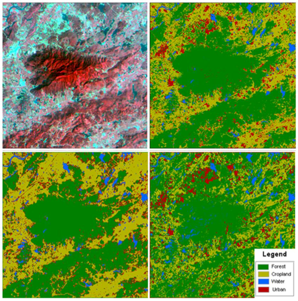 The subset image for area B in false-color ((upper left) R: band 4, G: band 3, B: band 2) and classified image using (upper right) spectral shape-based method, (lower left) SVM method and (lower right) MD method.