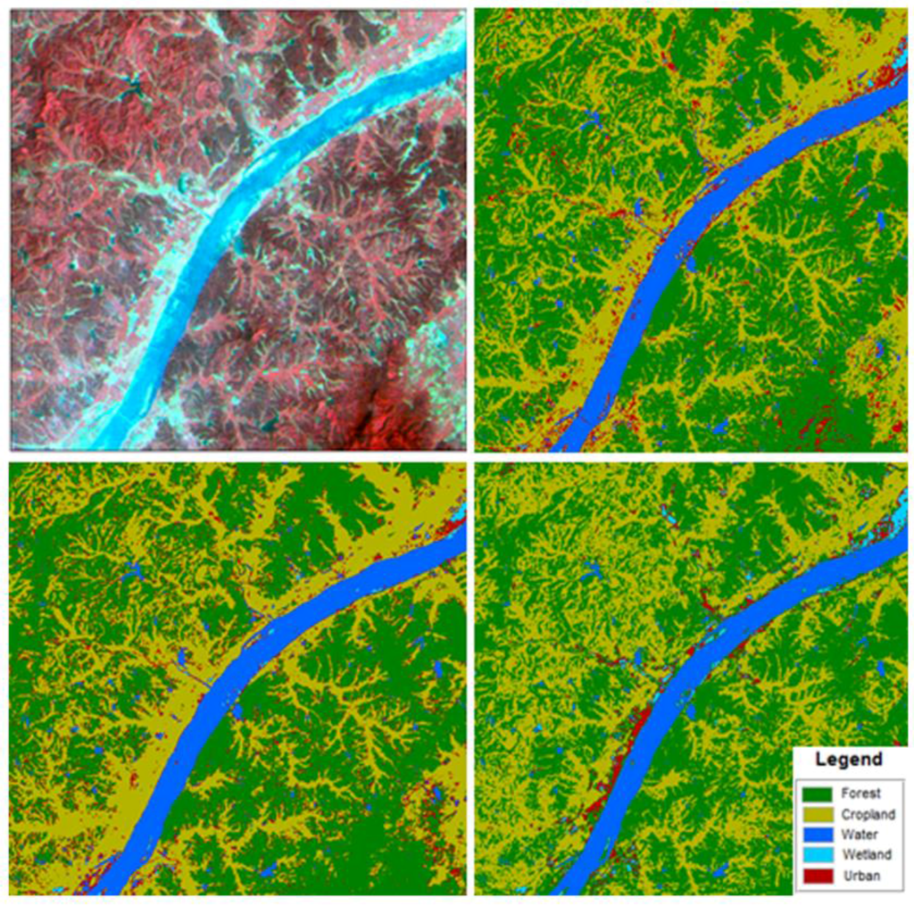 Land cover and its dynamics play a major role in the analysis and evaluation of the land surface processes that impact environmental, social, and economic components of sustainability [1,2]. Accurate and up-to-date land cover information is necessary. Such information can be acquired by use of remotely sensed image classification techniques [1]. Thus, remotely sensed image classification is of increasing interest in the present development of digital image analysis [3]. Over the last several decades, a considerable number of classification approaches have been developed for classification of remotely sensed data. The most commonly used approaches include the supervised and unsupervised classifications [4,5]. Many advanced classification methods have been presented in the past two decades, such as artificial neural networks (ANN) [6,7], support vector machine (SVM) [8,9], and decision tree classifiers [10,11]. Object-based image analysis (OBIA) [12,13,14], which is different from the pixel-based classifiers, has been reported to be effective for the problem of environmental heterogeneity.