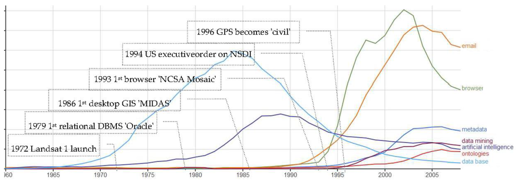 This finding legitimates the question of what lessons can be learned from these four decades. The rise of geomatics, as a comprehensive system of technologies, practices and products, then followed by its present relative fade, is symptomatic of greater changes that occurred in that period. The Figure 1 shows that AI and databases have followed a similar fate. Figure 1 also demonstrates that the change has occurred in 1995, when the use of the Internet became the principal vector of almost any other numerical technological development.