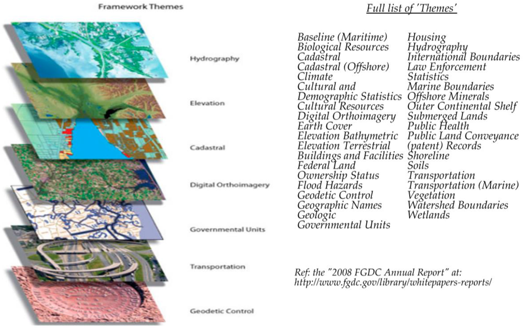 The many themes identified by the Federal Geographic Data Committee, collected by US agencies.