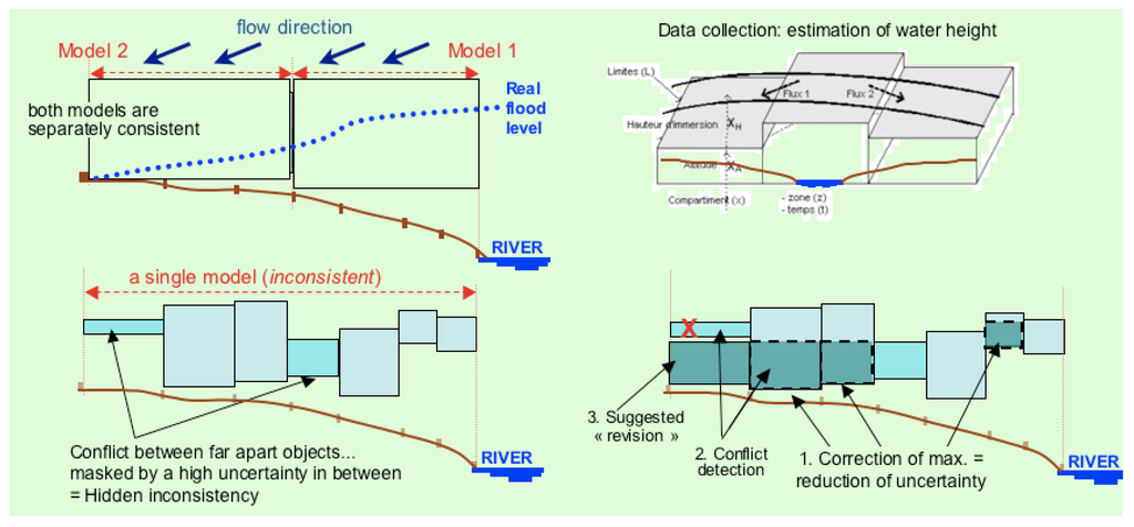 Considering that data are always somewhat inexact and always depending on a model, which imperfectly represents a partial aspect of the reality, it is important to provide guidelines. Every time we can input a constraint, we can confront the data, and issue a warning for each detected conflict. Figure 5 below is a snapshot to an experiment developed during the European project REV!GIS (Revision in GIS: 5th Framework Program project, involving the universities Keele, Laval, Leicester, Marseilles, Pisa, TUW Vienna, Twente ITC): to revise uncertain flood data using directions of flow as constraints []. The top-left and bottom-left diagrams demonstrate how two models, for two adjacent spatial zones, can be independently logically-consistent, but can result into an inconsistent model when merged. By using flow direction and constraints, the min and max estimations of the water height can be improved (shrinking the intervals), or sometimes enlarged for re-establishing global consistency. The process is computationally expensive: such AI algorithms are named NP-hard (for non-polynomial): artificial intelligence may bring solutions and may raise new problems as well.
