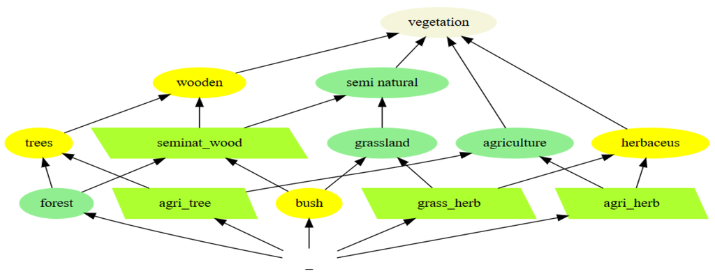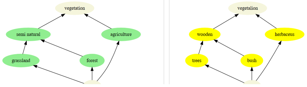 Figure 6 shows the (simplified) graphs resulting from two different surveys of the same region. Each land parcel receives a class value from both surveys, and we can derive the two Galois lattices (Figure 6): the partial order (e.g., forest > semi-natural) reflects the fact that every parcel observed and classified as “forest”, is also worded as “semi natural”. The goal is not to force one taxonomy to fall into the second, rather, to better understand which classes could be the problematic when comparing the ontologies []. We accept two postulates: (1) the land parcels belong to the same geographical world, and can be identified directly, providing that geometric errors have been properly corrected; and (2) the classes “vegetation” of the two lattices are supposed to be the same common universe. Geography allows making such postulates, what is not necessarily true for other sources of information in Big Data, such as a customer profiles, for instance.