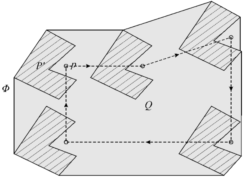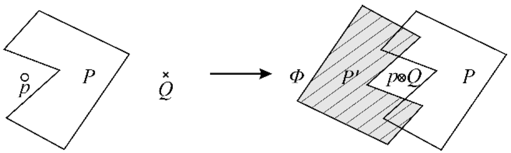 Region of movability problem. Let P = (p0, p1, ..., pm−1) be a polygon (p as its anchor point) in the plane, and Q = (q0, q1, ..., qn−1) be the background polygon (line or point). Then, in what region can the polygon P move arbitrarily without colliding with Q?
