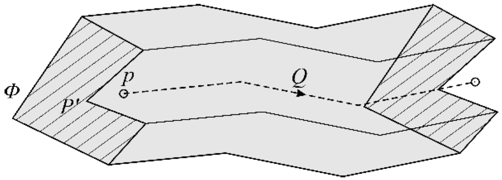 Let P be a polygon in the plane and Q be its background point, line, or polygon. P undergoes rigid-body displacement from its anchor point p, and P′ is the symmetric polygon of P with point p as the center. Then, Φ(p, P, Q), the region of movability for P, can be expressed as the complementary set of P′ ⊕ Q (as shown in Figure 4).