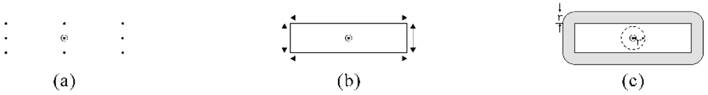 More natural than the fixed-position model or slider model, the key point of our model is that the surrounding zone of a point feature is utilized for label placement. As seen from Figure 5, the search space of the three main labeling models is presented (defined by the location of the label’s midpoint). For the fixed-position model with eight candidates, the search space is shown in Figure 5a with eight points, and the rectangular line in Figure 5b represents the search space for the slider model. The search space of our model is depicted in Figure 5c with a rounded rectangle. Thus, for any label in this space, its distance to the point feature is less than the threshold value r, and does not overlap the point feature. The search spaces of the fixed-position model and slider model are contained by the search space of our model. The labeling result would benefit from the extended and complete search space.