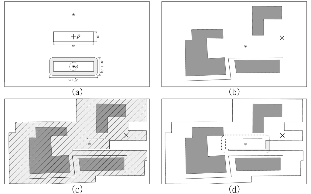 Then, the conflict-free candidate search space of a point feature is generated by taking the complementary set of these immovability regions. The detailed flow diagram of this process is shown in Figure 6, in which (a) shows the schematic diagram of the point feature, label textbox size, and the whole surrounding search space for labeling (as already described in Figure 5c). Then, a label placement case is shown in (b), with the dot standing for the point feature to be labeled, whereas the other points, lines, and areas are adjacent obstacle features. The corresponding region of immovability is illustrated in (c), denoted by the shaded area. Finally, the whole conflict-free labeling space is obtained in (d), as shown by the gray zone within the dashed box. Only if the midpoint of the label is located in this zone is there no conflict with these background features.
