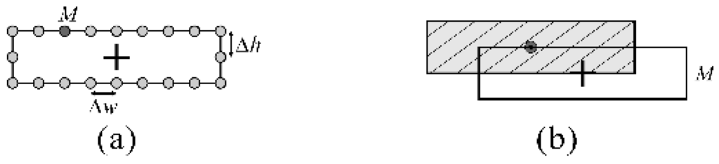- Equally divide the outline of the label textbox with the horizontal and vertical intervals of w and h to produce n discrete points as the reference points for distance computation, as shown in Figure 7a.