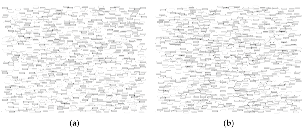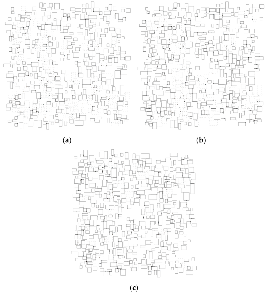 For most previous studies, labeling experiments that only concern the point features have been conducted. The datasets for labeling experiments with only point features are from previous representative research [2,38], namely, the RandomRect, RandomMap, and VariableDensity instances. And they are available at the labeling website [39]. The first instance in RandomRect, RandomMap, and VariableDensity with 500, 500, and 1000 points, respectively, are chosen for the labeling comparisons. The labeling results are presented in Figure 10, Figure 11 and Figure 12, and the conflicting labels are lighter in color and marked by dotted rectangles.
