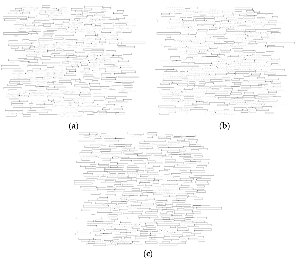 Labeling result for the RandomRect instance with 500 points. (a) Four-position model: 339 conflict-free labels; (b) four-slider model: 380 conflict-free labels; (c) the proposed model: 450 conflict-free labels.