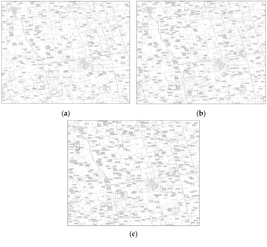 Detailed comparisons within the rectangular regions for the RoadResident instance. The Chinese words are the geographic names to be labeled with no conflict. (a) Four-position model; (b) four-slider model; (c) the proposed model.