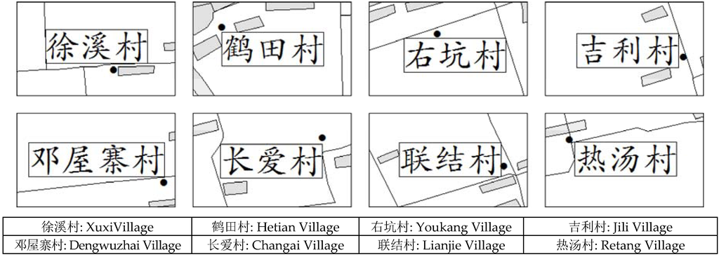 In addition, some representative labeling cases of the proposed model are illustrated in Figure 15, which are difficult to be managed by the fixed-position model and slider model, because the obtained labels are not at certain fixed positions or restricted to a sliding track line. Thus, based on the region of movability, a conflict-free label can be placed once there is a blank space in the surrounding zone of point feature.