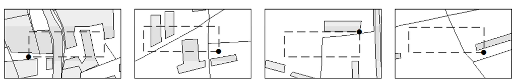 Because the fixed-position model with four candidates is commonly used in previous research for map labeling, as a comparison, when w and h are set equal to the width and height of the label textbox, the four candidates generated by our model are shown in Figure 8. The four reference points for the distance computation are depicted in Figure 8a. The generated four candidate label positions for the non-obstacle case and with-obstacle case are presented in Figure 8b,c (the obstacle lines and areas are indicated by the dotted lines in the figure). For the fixed-position model and slider model, the conflict-free candidates in Figure 8c would be missed.