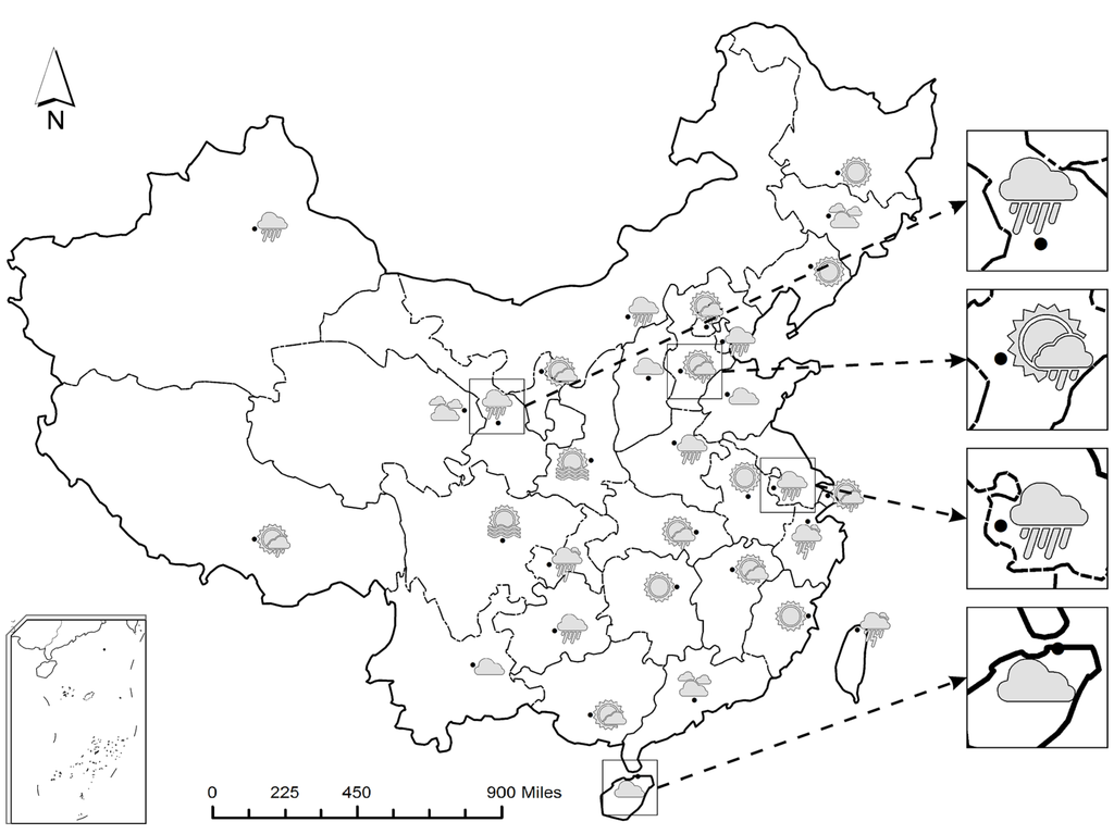 So far, only rectangular shaped labeling has been discussed. The proposed model can be extended to place arbitrarily shaped labels. The WeatherMap instance is used in this labeling experiment, which shows the weather conditions of the provincial capitals in China. As seen from the labeling result in Figure 17, most of the arbitrarily shaped weather symbols are successfully assigned to points on the premise of being conflict-free with the map context features. Some of the labels in this figure cannot be easily handled with the fixed-position model or slider model.