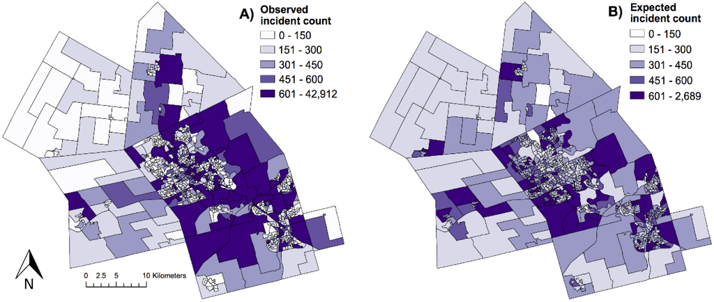 Geographic distribution of (A) count of all police calls-for-service in 2011 and (B) expected count of calls-for-service.
