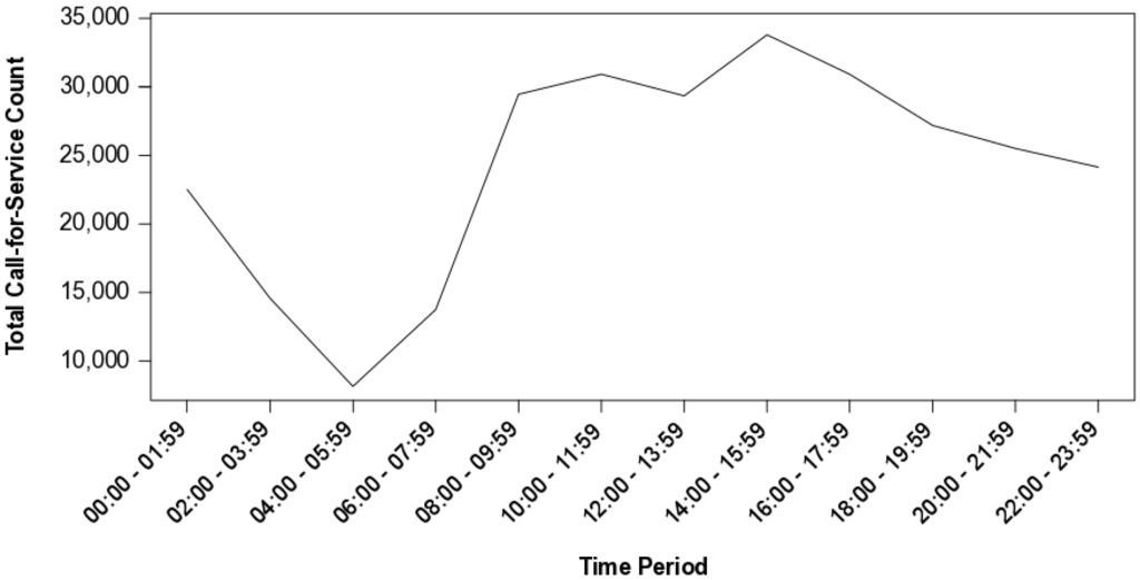 In law enforcement, the implementation of computer-aided dispatch systems that automatically record location- and time-specific information for police calls-for-service has facilitated the storage, retrieval, and analysis of large volumes of spatio-temporal data [,,,,]. Paired with technological advances in geographic information systems, crime mapping, or the analysis and visualization of historical spatial and temporal police call-for-service patterns, has become an important part of police operations and strategy []. Police calls-for-service encompass reported crimes, emergency response, traffic management, and other police-facilitated services [], and compared to official crime data, provide a more comprehensive indicator of overall police resource demand. Increasingly, call-for-service data is available at fine spatial and temporal resolutions, enabling detailed analysis of local Space-time variation.