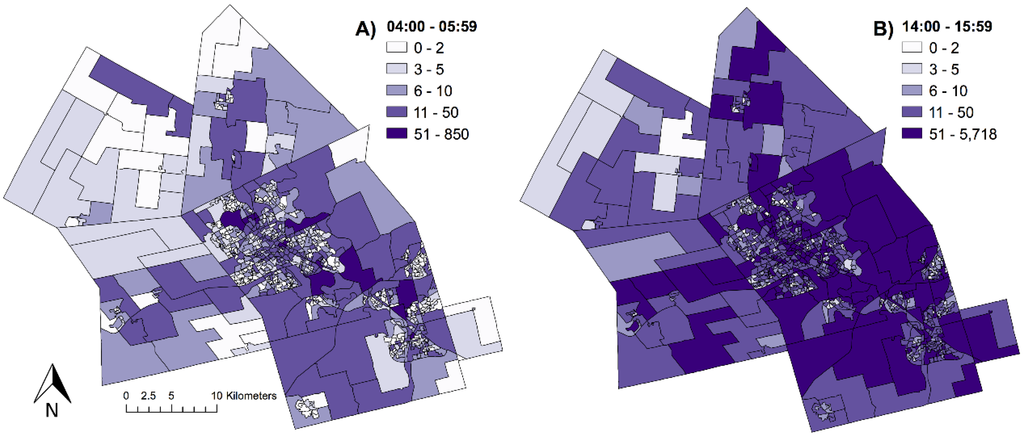 The spatial patterns of calls-for-service are shown in Figure 3 for 04:00–05:59 (Figure 3A), the time period with the lowest observed count, and for 14:00–15:59 (Figure 3B), the time period with the highest observed count. Compared to 14:00–15:59, there were fewer areas with high counts (>50) during 04:00–05:59 and high-count areas were located closer to the main transportation corridor connecting Waterloo, Kitchener, and Cambridge. From 14:00 to 15:59, there were many more areas with high call-for-service counts and these areas were geographically dispersed throughout the study region.