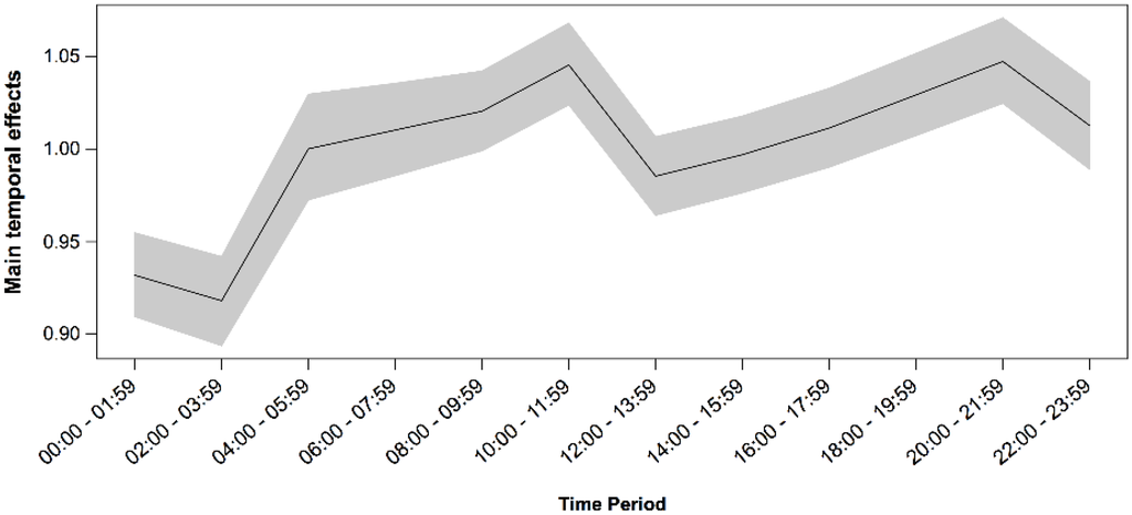 Main temporal effects are shown in Figure 4 and were lowest in the early morning between 02:00 and 03:59 (0.918, 95% CI: 0.894, 0.942) and highest in the evening between 20:00 and 21:59 (1.047, 95% CI: 1.025, 1.071). There was an increasing trend from early morning to the middle of the day, peaking at 10:00–11:59 (1.045, 95% CI: 1.024, 1.068), followed by a decrease at 12:00–13:59 and a gradual increasing trend through the evening. This temporal pattern is noticeably different from the observed data, where the highest number of calls-for-service occurred between 14:00 and 15:59. This can be attributed to the ICAR smoothing imposed on φt as well as the simultaneous analysis of spatial variation of calls-for-service.