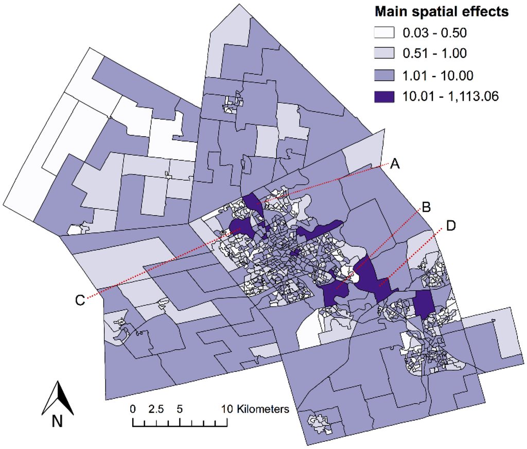 Main spatial effects highlight the general spatial pattern of police calls-for-service. Areas with high spatial effects have consistently high numbers of calls-for-service and are areas where police resources should be directed for all time periods. Exploring the characteristics of Areas B, C, and D provides insight into reasons these areas may have high spatial effects. The study region’s largest shopping centre and a major transit node are located in Area B and frequently occurring incidents in this area were motor vehicle stops (1108), minor motor vehicle collisions (187), and traffic enforcement (169). Area C contains a large university and student housing and incidents were largely composed of lost or damaged property (1257), general emergency calls (220), and small theft (372). Area D contains a major highway that transects the study region and calls-for-service in this area were dominated by emergency calls (38,173), incidents recorded as part of routine detail (750), and vehicle stops (459).