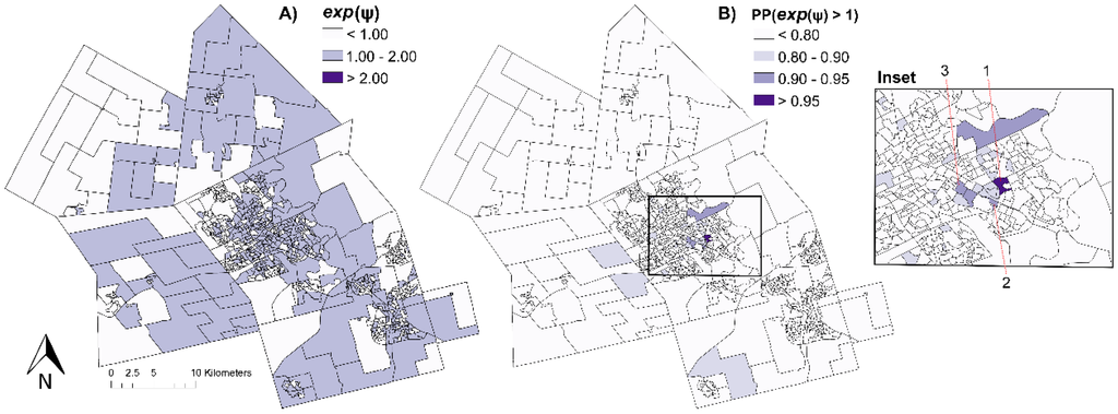 Space-time hotspots, identified by evaluating the posterior probability of exp(Ψit) > 1.0, are specific areas that require additional law enforcement resources to handle high numbers of calls-for-service. Posterior probability ranges from 0 to 1 and enables hotspot areas to be ranked based on the strength that exp(Ψit) > 1.0. The three areas with greatest PP for 10:00–11:59 and 20:00–21:59 are shown in Figure 6B and Figure 7B (labelled as Areas 1, 2, and 3), respectively. During 10:00–11:59, Space-time hotspots were found to be concentrated in the central business area of Kitchener, but located close to a local university during 20:00–21:59.