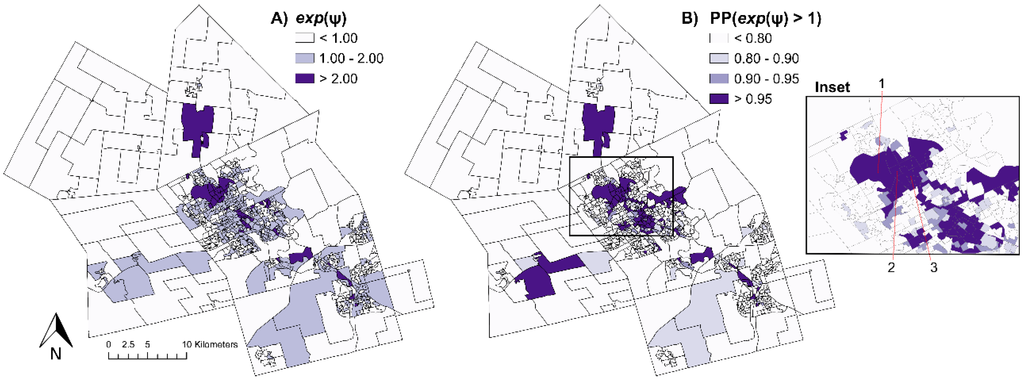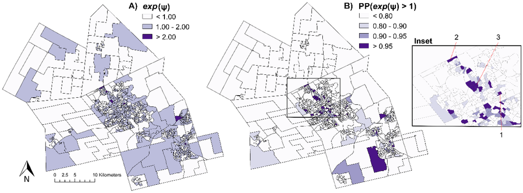Space-time interaction estimates area-specific departures from main spatial and main temporal effects [] and indicates if additional resources are needed for specific areas apart from baseline spatial and temporal resource allocations. For 10:00–11:59, there were no areas with exp(Ψit) > 1.5 and areas with moderate Space-time interaction were dispersed throughout the study region (Figure 6A). In comparison, during 20:00–21:59, there were 63 areas with exp(Ψit) > 1.5 and these areas were concentrated in and around central business areas (Figure 7A). This may be explained by the shifting patterns of routine activities of residents []: daytime employment and leisure activities are geographically dispersed in urban, suburban, and rural areas of the study region, while central business areas are where evening leisure activities are concentrated [,].