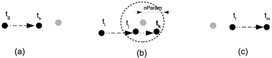 Interactions between a moving object (black) and a context element (grey): (a) approaching; (b) stopping; (c) moving-away.